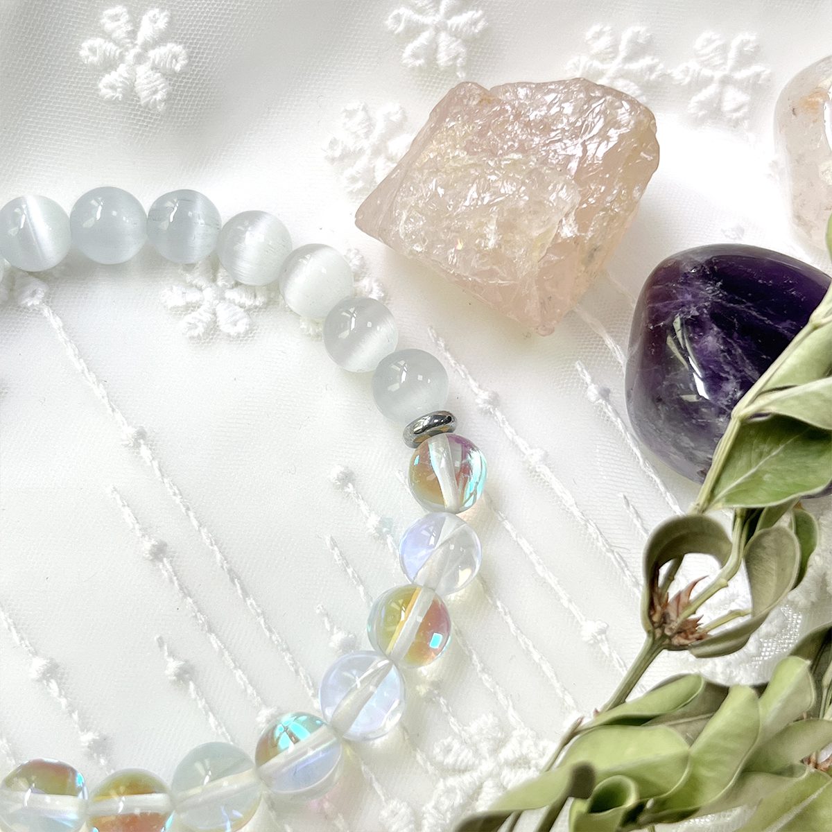 For the modern witch, the crystal enthusiast, the busy professional, or anyone who needs a little more peace and softness in their life, this bracelet brings together the soothing power of white cat’s eye and the cleansing magic of angel aura quartz, for everyday magic that fits seamlessly into your life.